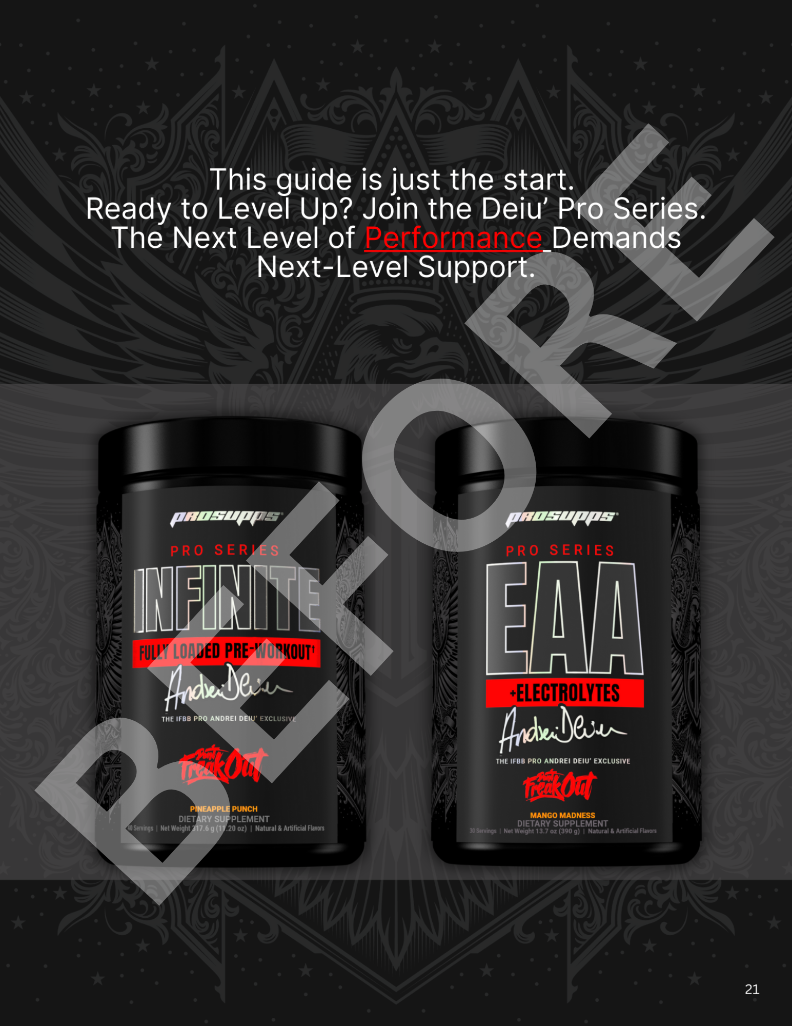 I redesigned a digital e-book for ProSupps, originally sold online and through GNC as part of their collaboration with IFBB Pro Andrei Deiu for the Pro Series pre-workout line. The comparison shown highlights the transformation: on the left is the original version, and on the right is my redesigned version, optimized to be visually engaging while staying true to ProSupps' brand identity.